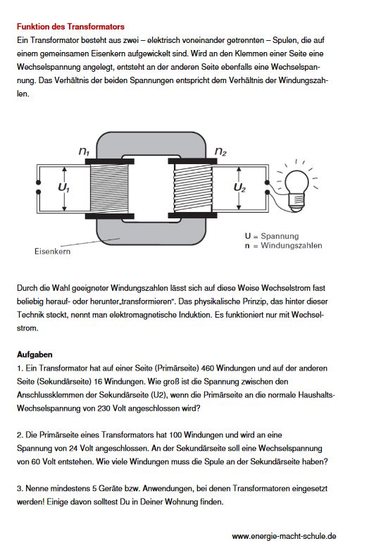Transformator Physik Arbeitsblatt zum Herunterladen
